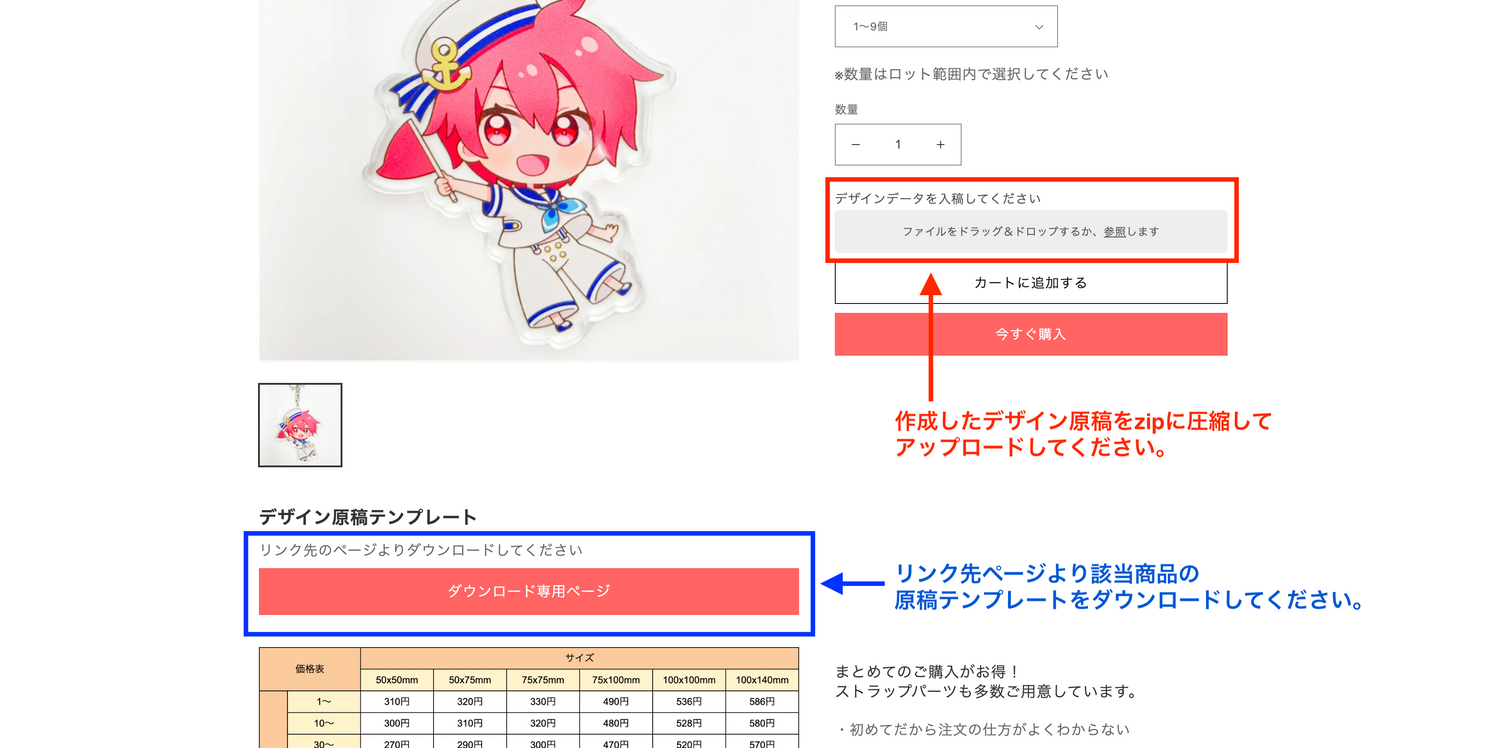 ・デザイン原稿をzipに圧縮してをドラッグ&ドロップまたは選択してアップロードしてください。(アップロード必須です。)