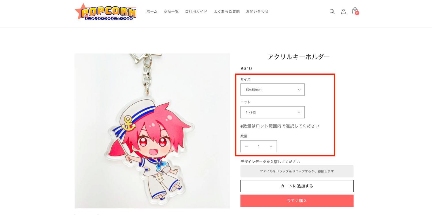 ・作成したい個数を入力してください。この時、直前で選択したロット数の範囲内の個数をお選びください。