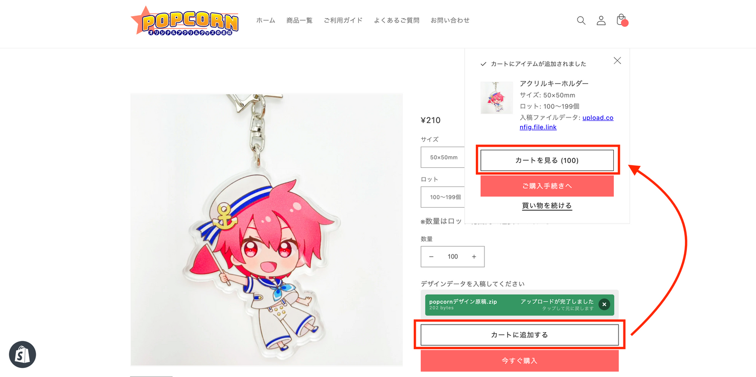 ・サイズ・ロット・数量・原稿アップロードが完了したら「カートへ追加する」>「カートを見る」を押してください。