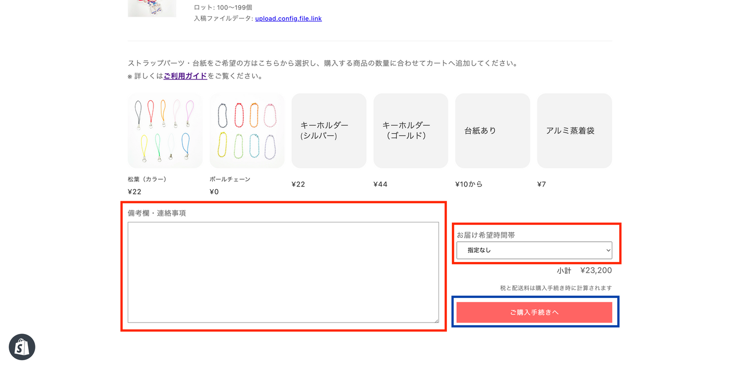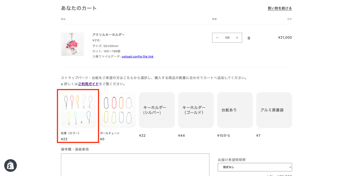 ・カート画面からお好みのストラップパーツ・台紙を希望の方は選択し、カートへ追加してください。