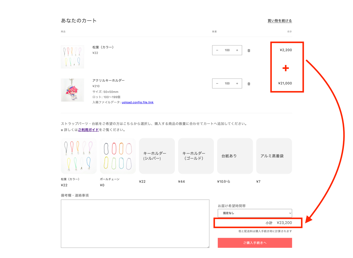 ・選択した商品の数量やオプションの小計、全商品の合計金額が表示されます。