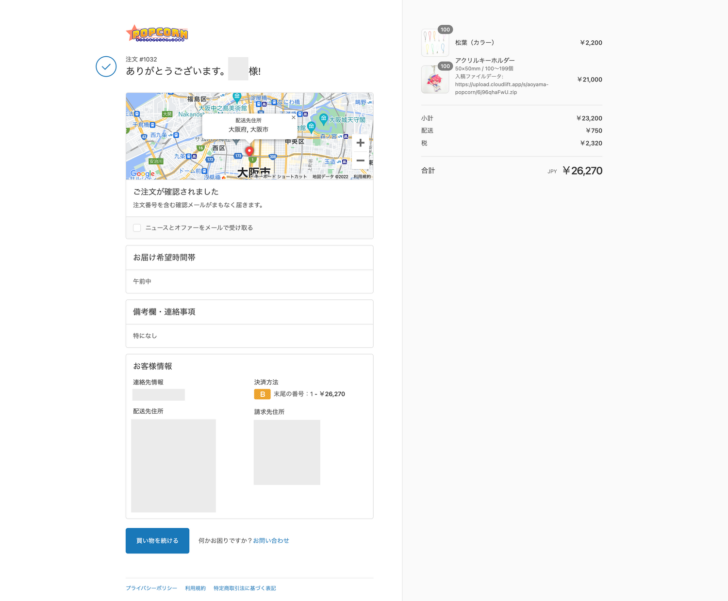 通常の送り主は「アクリル工房ポップコーン」となりますがご希望があればご指定の送り主で発送いたします。